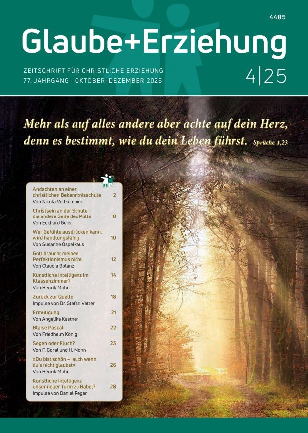 Die quartalsweise erscheinende Zeitschrift Glaube+Erziehung der Evangelischen Lehrer- und Erziehergemeinschaft möchte eine am christlichen Menschenbild und an christlichen Wertmaßstäben orientierte Erziehung und Bildung fördern. Mit seismographischem Gespür versucht sie, pädagogisch bedeutsame gesellschaftliche und schulische Entwicklungen auf der Basis des christlichen Glaubens und dem Bildungsauftrag des Evangeliums zu analysieren und konstruktiv zu bewerten. Die Zeitschrift bietet eine Fülle von sorgfältig recherchierten, biblisch fundierten und komplizierte Sachverhalte auf den Punkt bringende Artikel.
